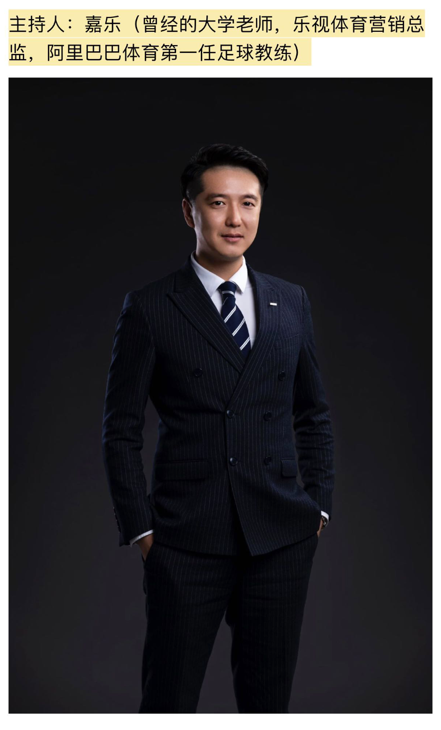 主持人:嘉乐(曾经的大学老师,乐视体育营销总监,阿里巴巴体育第一任足球教练)