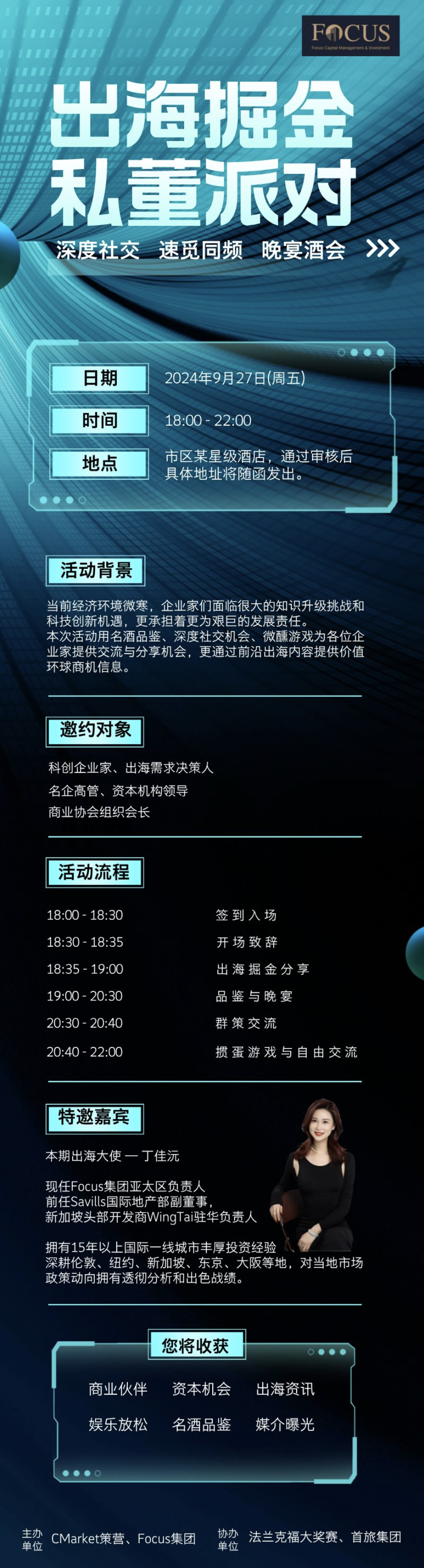 1、参与对象:科创企业家、出海需求企业家、名企高管、资本机构领导等。2、需上传本人名片,审核1个工作日。
