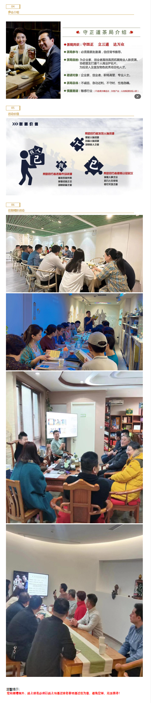 【守正道同行者联盟】是一个以传承三道文化,守正立己达人为宗旨的活动组织,联盟是口号是一个丰盛有爱的家庭,一个立己达人的组织,通过倡导意守四正,身立三道,法达万众的生活、工作理念,让参与的每一个都能亲情浓,爱情蜜,事业稳,财富丰的组织目标。联盟通过茶局、宴局、读书会、研学等各种特色活动让每一个成员都能找到爱,找到力量,找自己,实现人生的幸福,生命的绽放!期待有缘的同仁志士的加入!