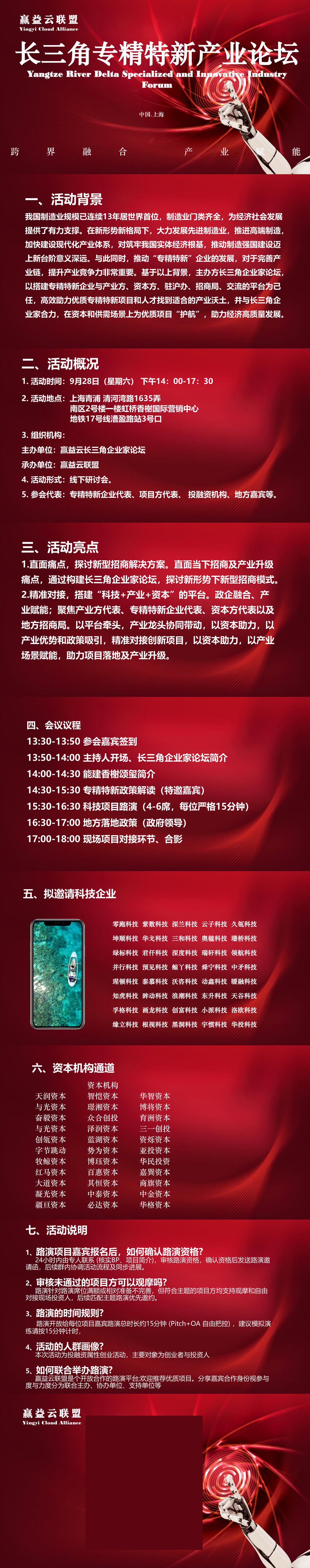 加快建设现代化产业体系,对筑牢我国实体经济根基,推动制造强国建设迈上新台阶意义深远。与此同时,推动“专精特新”企业的发展,对于完善产业链,提升产业竞争力非常重要。基于以上背景,主办方长三角企业家论坛以搭建专精特新企业与产业方、资本方、驻沪办、招商局、交流的平台为己任,高效助力优质专精特新项目和人才找到适合的产业沃土,并与长三角企业家合力,在资本和供需场景上为优质项目“护航”,助力经济高质量发展。