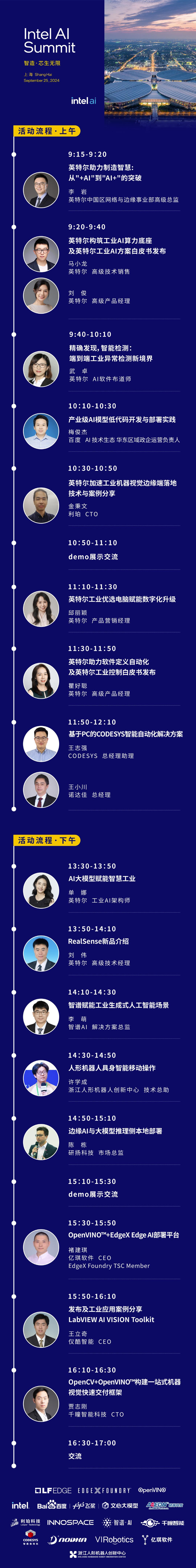 AI芯片的研发和应用也进一步推动了工业变革,为了更好地迎接这一变革,英特尔携手百度、利珀、CODESYS 、诺达佳、智谱AI、浙江人形机器人创新中心、研扬科技、亿琪软件、仪酷智能、千瞳智能科技等众多行业领袖和技术专家,聚焦“智造·芯生无限”,共同带来技术洞见与解决方案,从不同角度深入探讨AI在工业领域的应用和发展趋势。
