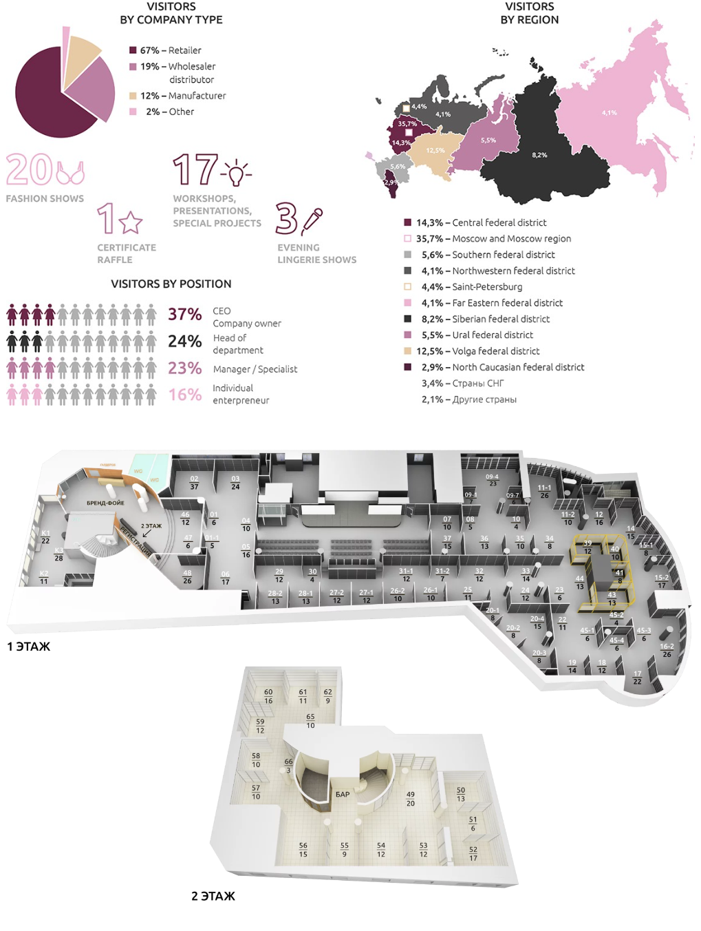 展商:150 家,分别来自 25个国家观众:3500 专业人士,分别来自俄罗斯及其他国家的 350 个城市