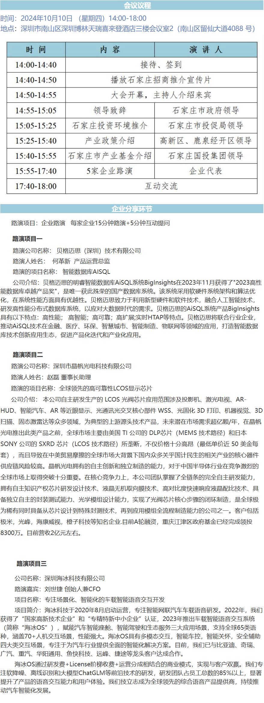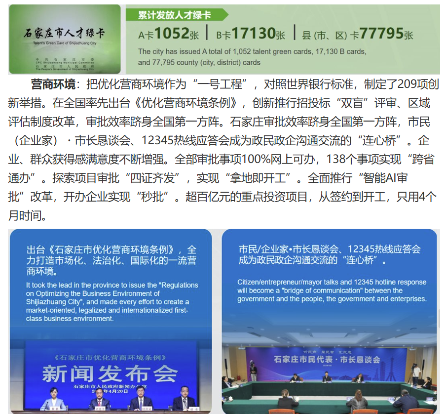 1. 政府对接:与石家庄市政府、投资促进局、石家庄高新区、石家庄经开区、河北鹿泉经济开发区等单位领导面对面交流;