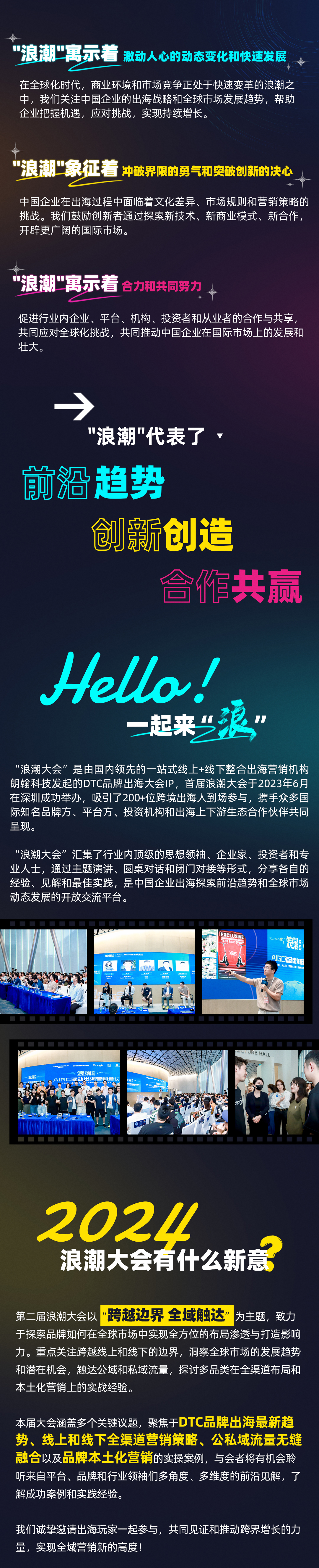 "浪潮大会”是由国内领先的一站式线上+线下整合出海营销机构朗翰科技发起的DTC品牌出海大会IP,首届浪潮大会于2023年6月在深圳成功举办,吸引了200+位跨境出海人到场参与,携手众多国际知名品牌方、平台方、投资机构和出海上下游生态合作伙伴共同呈现。