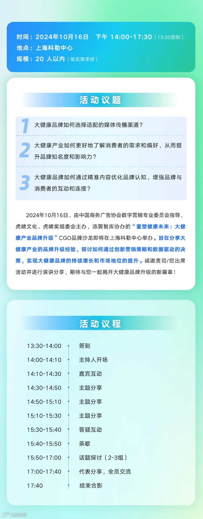 2024年10月16日,由中国商务广告协会数字营销专业委员会指导虎啸文化、虎啸奖组委会主办,添翼智库协办的“重塑健康未来:大健康产业品牌升级”CGO品牌沙龙即将在上海科勒中心举办。旨在分享大健康产业的品牌升级经验,探讨如何通过创新营销策略和数据驱动的决策,实现大健康品牌的持续增长和市场地位的提升。诚邀贵司/您出席活动并进行演讲分享,期待与您一起揭开大健康品牌升级的新篇章!