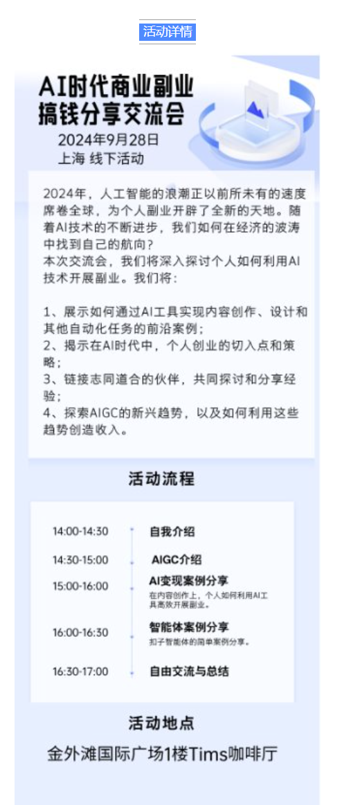 本次交流会,我们将深入探讨个人如何利用AI技术开展副业,如何在经济挑战中找到自己的立足点。我们将: