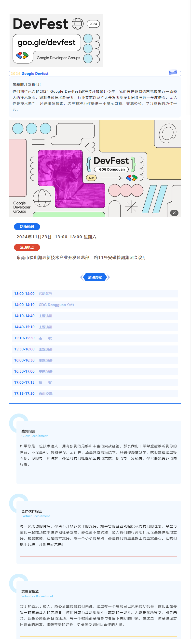 你们期待已久的2024 Google DevFest即将拉开帷幕!今年,我们将在蓬勃德东莞市举办一场盛大的技术聚会,诚邀各位技术爱好者、行业专家以及广大开发者朋友共同参与这一年度盛会。无论你是技术新手,还是资深极客,这里都将为你提供一个展示自我、交流经验、学习成长的绝佳平台。