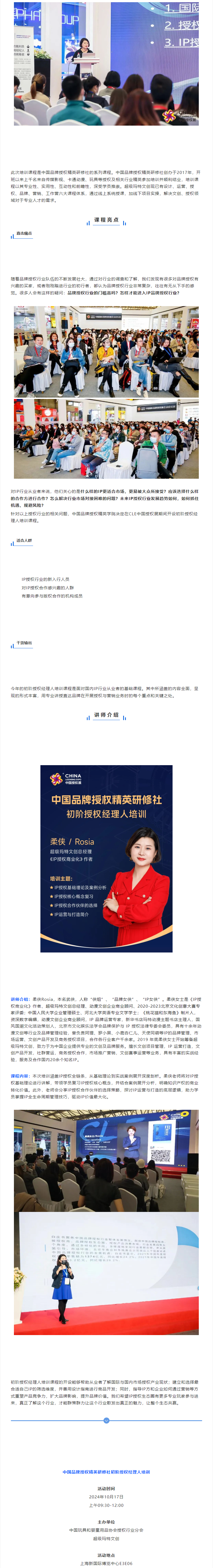 作为本届CLE中国授权展的重磅内容之一,中国品牌授权精英研修社初阶授权经理人培训活动将于10月17日上午09:30-12:00开课。此次培训为公益课程,由中国玩具和婴童用品协会授权行业分会和超级玛特文创共同主办。课程旨在聚焦行业热点,推动跨界合作,鼓励行业创新,促进IP授权行业的高质量发展。