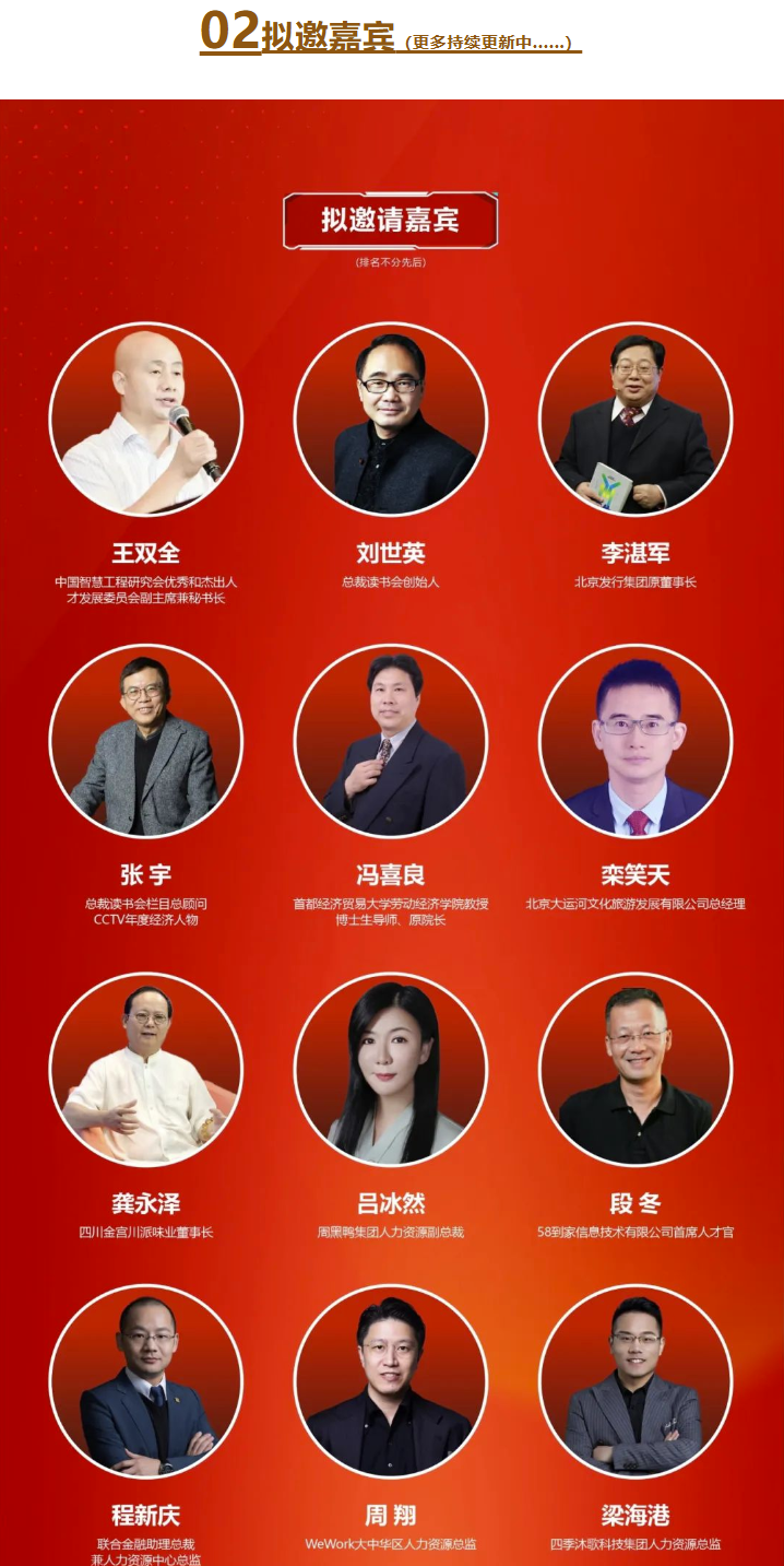 亮点三:嘉宾将围绕新质生产力下的人力资源人工智能融合发展,雇主品牌建设、未来职场形态展望、人才发展新模式探讨、组织文化重塑与变革管理展开,将全面展现新质生产力下人力资源管理的创新成果与变革趋势。为与会者提供一个高端学习交流、共谋发展的平台。