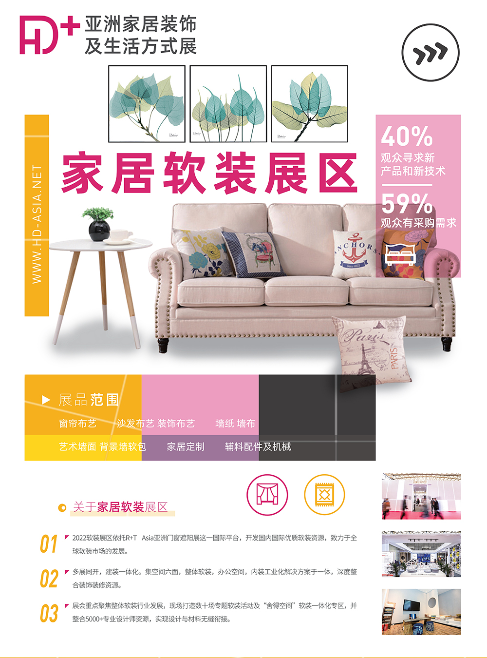 上海亚洲家居装饰展览会(HD+ Asia)不仅是一站式家居软装、智慧家居、户外家居采购平台,同期R+T Asia亚洲门窗遮阳展,打造全系列家居装饰选材盛会。作为华东地区一站式高端家居软装、智慧家居、户外家居采购平台,为行业带来高端纺织品面料流行趋势,高精尖智能家居技术及产品,户外家居休闲生活全系列产品解决方案。