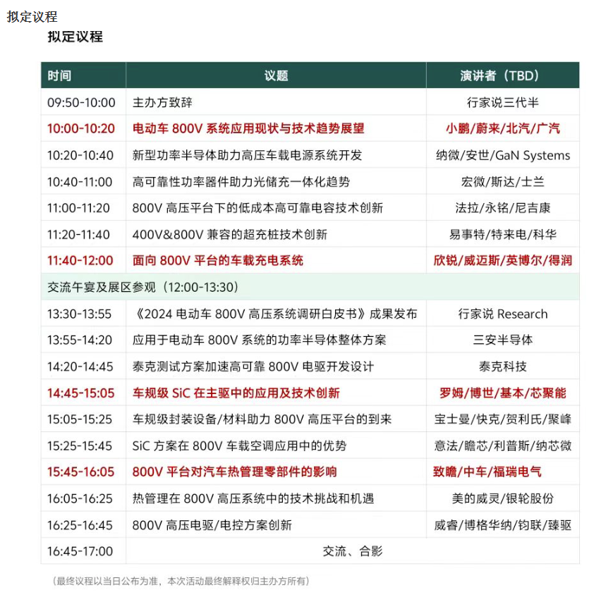 为了共同推动新能源汽车向800V高压平台的升级,2024年8月,行家说将在深圳举办“新能源汽车800V高压系统与功率半导体技术大会”,携手汽车OEM、电池、电驱、电控、车载电源、充电桩、IGBT、碳化硅、氮化镓以及其他元器件企业,针对800V高压平台的关键技术进行深入讨论,旨在为行业带来最新技术和应用方案。