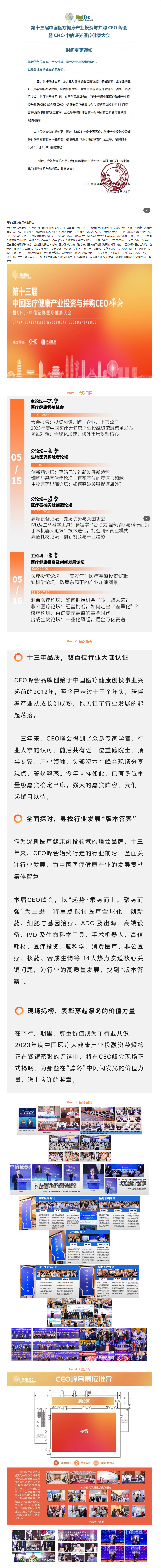 全球经济复苏尚缓,中国医疗健康企业在资本收紧与内核重塑的理性回归中 抗压前行,跨越生存与发展的现实考验,在创新与价值创造间寻求平衡。面对新 经济周期的挑战,如何“识势”而为,抓住海外市场攻坚核心;“乘势”发展, 在医药创新的探险中拨云见日;“造势”突围,引领高端器械尖峰创造;“蓄势” 而发,开拓新技术赛道蓝海宏图?起势谋远,亟待破题。 9月,第十三届中国医疗健康产业投资与并购 CEO 峰会暨 CHC·中 信证券医疗健康大会在深圳举行。本届峰会以“起势·乘势而上,聚势 而强”为主题,涵盖医疗健康领袖峰会、生物医药探险者论坛、医疗器械尖峰创 造论坛、医疗健康创新发展论坛四大板块,重点探讨医疗全球化、创新药、细胞 与基因治疗、ADC 及出海、高端设备、IVD 及生命科学工具、手术机器人、高值 耗材、医疗投资、脑科学、消费医疗、非公医疗、核药、合成生物等 14 大热点 赛道核心关键问题。 峰会汇聚重磅院士、顶尖专家、产业领袖、头部资本、创新园区,1000+医 疗生态圈精英人士,联合医疗健康全产业链创新力量,强势赋能中国医健产业迭 新发展。诚邀您出席峰会,聚势共赢,谋未来!