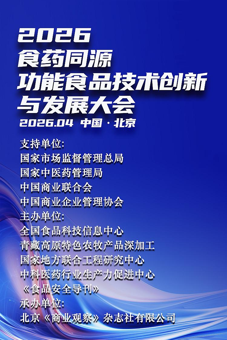 为深入贯彻落实我国印发的《“健康中国”2030规划纲要》以及农业农村部、国家卫生健康委员会、工业和信息化部联合印发的《中国食物与营养发展纲要(2025—2030年)》等重要文件精神。传承和发扬中华民族食药同源的智慧结晶,进一步推动食药同源领域科技创新和成果转化。由全国食品科技信息中心、青藏高原特色农牧产品深加工国家地方联合工程研究中心、中科医药行业生产力促进中心、《食品安全导刊》主办的“2026食药同源功能食品技术创新与发展大会”拟于2026年4月在北京举办。