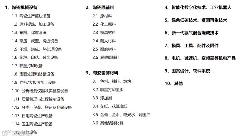 无论是建筑陶瓷、卫生陶瓷,还是日用陶瓷、艺术陶瓷,或者工业陶瓷、特种陶瓷等相关领域的企业,都可以在这个展会上找到生产所需要的原料辅料、装饰材料、耐火材料、耐磨材料、机械设备、零配件磨具工具……等产品、工艺技术和创新解决方案。展品类别丰富多样,满足不同买家需求!