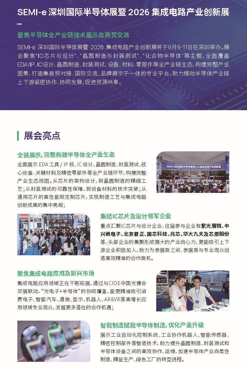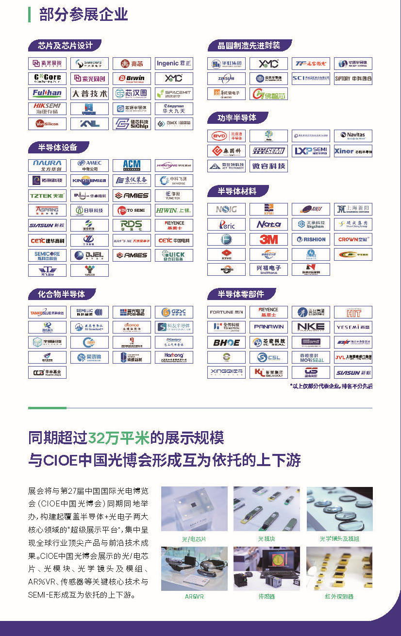 深圳国际半导体展(SEMI-e)积极抓住深圳半导体产业发展机遇,推动打造涵盖设计、制造、密封、测试的半导体及集成电路产业链。长电科技、铅芯、芯片宏碁微、盛美半导体、长川科技、广纳研究院、鼎华智能、罗博半导体、苏磁智能、华信将出席。