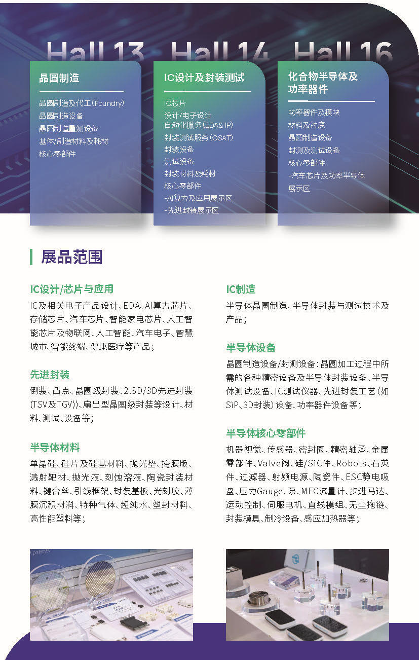 深圳国际半导体展(SEMI-e)将聚焦半导体产业的各个细分领域,展示以设计、芯片、晶圆制造和封装为基础的半导体产业链、半导体专用设备和组件、先进材料、第三代半导体、汽车半导体/汽车规模先进封装技术。全面展示半导体产业新技术、新产品、新亮点、新趋势,构建半导体产业通信融合新生态。