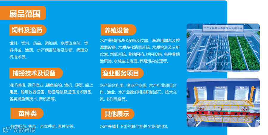 饵料、饲料、药品、添加剂、水质改良剂、饲料机械、渔药、水产病害防治及诊断、病理分析技术等。