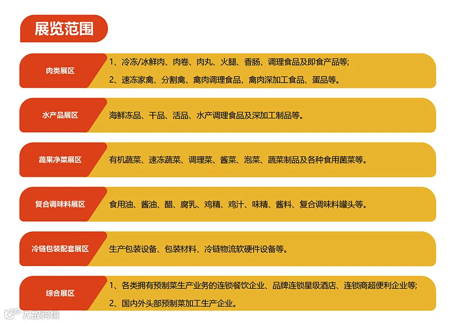 1、冷冻/冰鲜肉、肉卷、肉丸、火腿、香肠、调理食品及即食产品等。