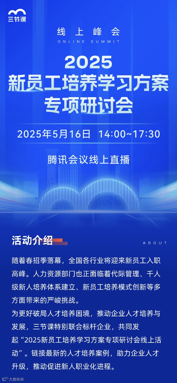为更好破局人才培养困境,推动企业人才培养与发展,三节课特别联合5大权威机构,共同发起“打破传统新员工培训方式的线上峰会活动”。链接最新的人才培养案例,助力企业人才升级,推动促进新人职业化进程。