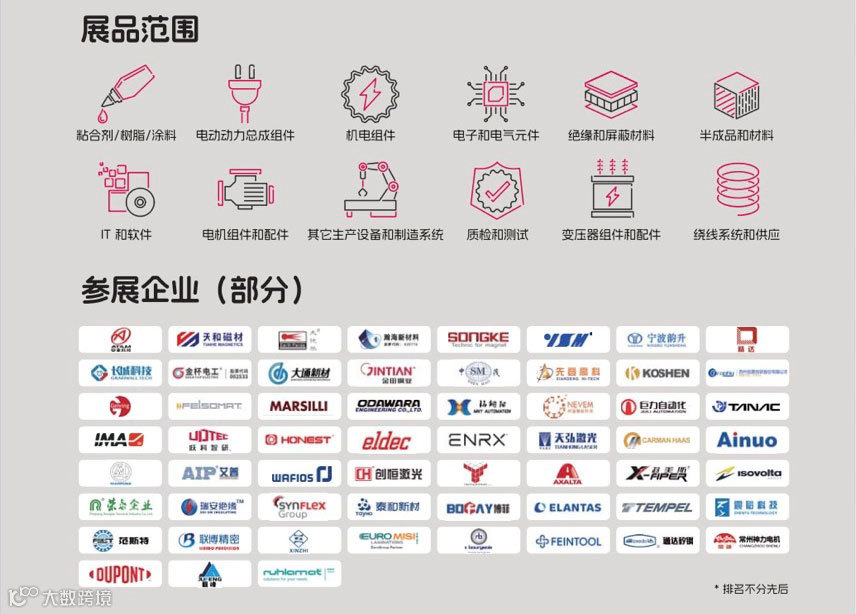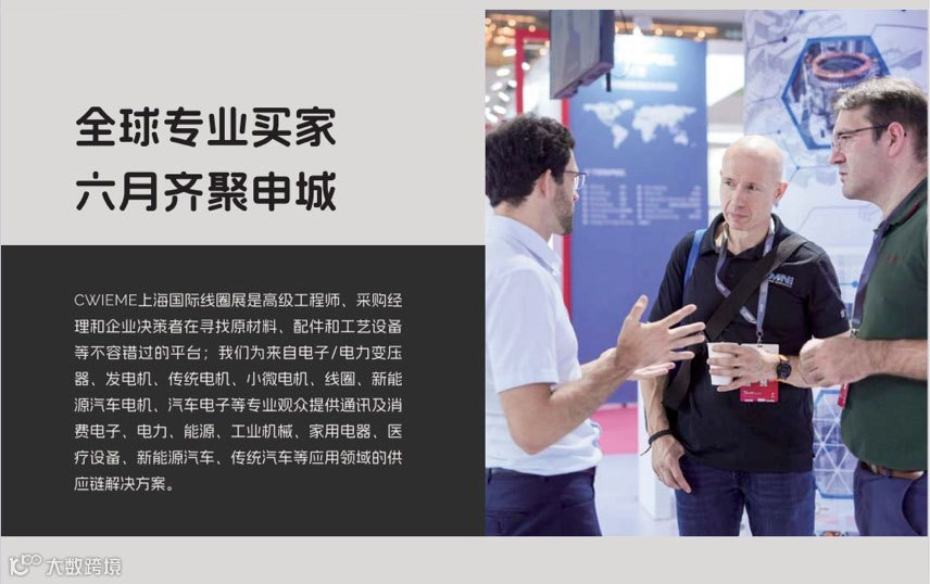 CWIEME上海国际线圈展及电机展是高级工程师、采购经理和企业决策者在寻找原材料、配件和工艺设备等不容错过的平台。展会为来自电子/电力变压器、发电机、传统电机、小微电机、线圈、新能源汽车电机、汽车电子等专业观众提供通讯及消费电子、电力、能源、工业机械、家用电器、医疗设备、新能源汽车、传统汽车等应用领域的供应链解决方案。
