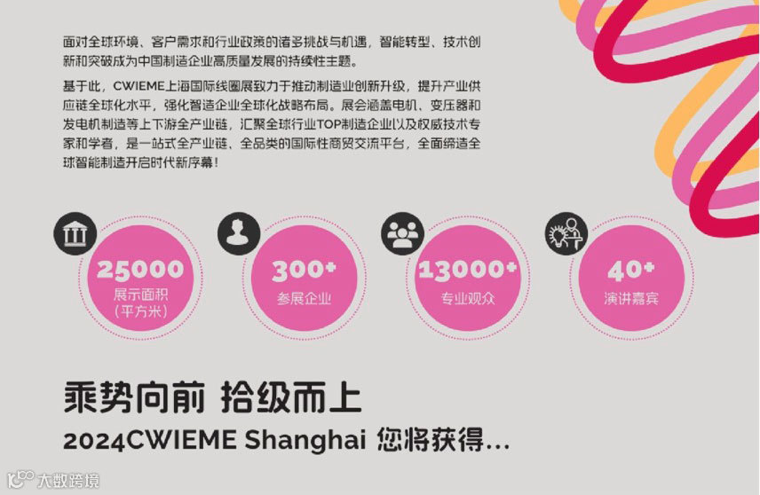 CWIEME Shanghai即上海国际线圈展是亚洲专业的线圈、电机和变压器制造的国际性展会,是CWIEME全球系列展中增长较快的展会。由有着丰富办展策展经验和强大国际性行业资源的Hyve集团主办,是全球一站式全产业链、全品类的国际商贸交流平台。