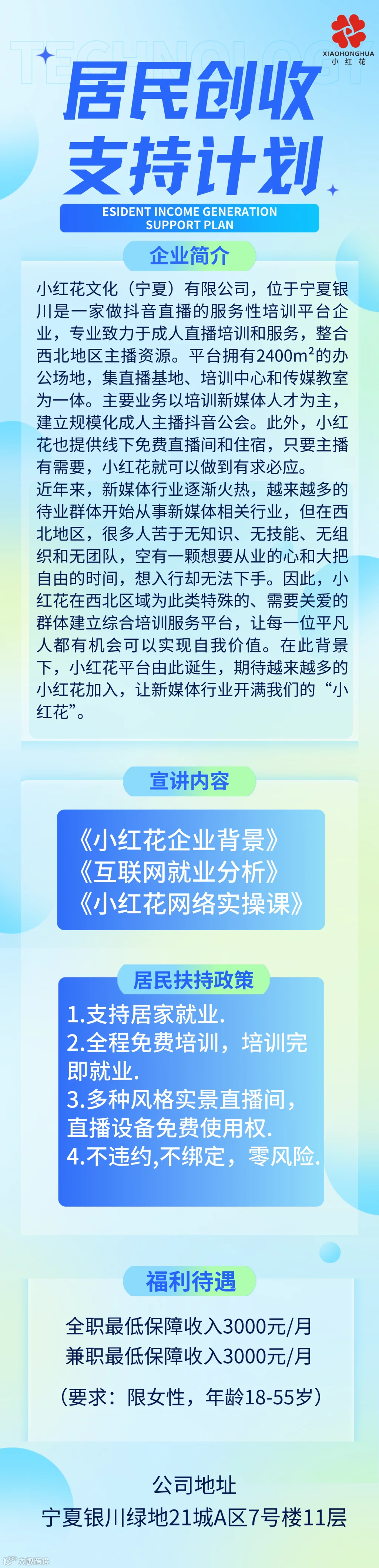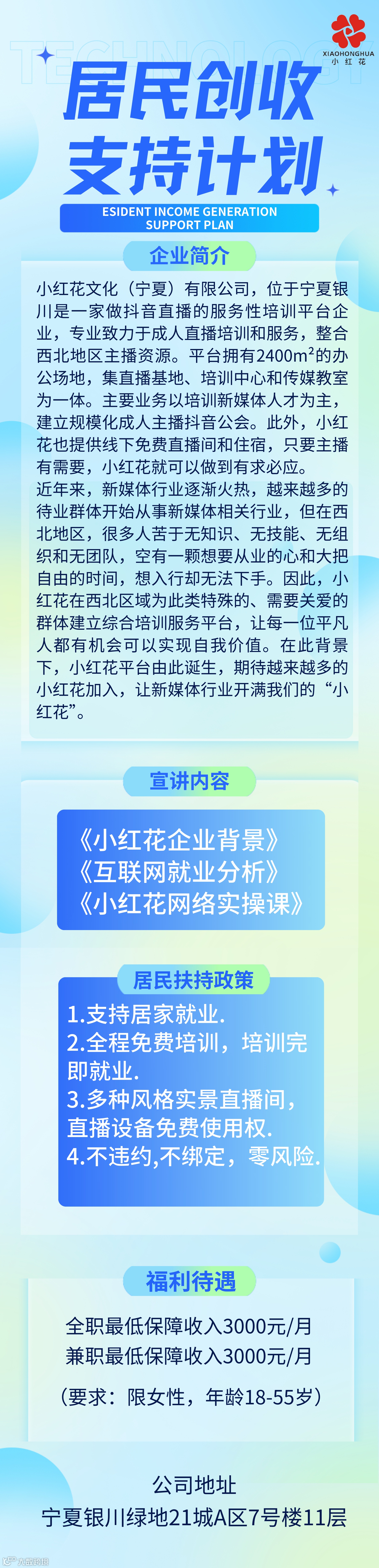 小红花文化(宁夏)有限公司,位于宁夏银川,是一家基于互联网岗位开展的技能培训服务平台,专业致力于摄影剪辑、短视频制作,直播变现、橱窗带货、本地生活、知识付费、星图广告、短剧演员、播音主持、舞蹈、声乐、书法等技能培训,整合西北地区互联网资源。平台拥有2400㎡的办公场地,集互联网直播基地、培训中心和传媒教室为一体。主要业务以培训新媒体人才为主,建立规模化互联网人才摇篮。