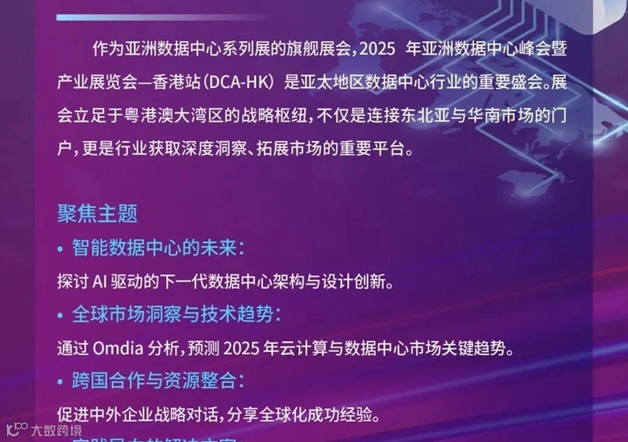 作为亚洲数据中心系列展的旗舰展会,2025年亚洲数据中心峰会暨产业展览会—香港站(DCA-HK)是亚太地区数据中心行业的重要盛会。展会立足于粤港澳大湾区的战略枢纽,不仅是连接东北亚与华南市场的门户,更是行业获取深度洞察、拓展市场的重要平台。