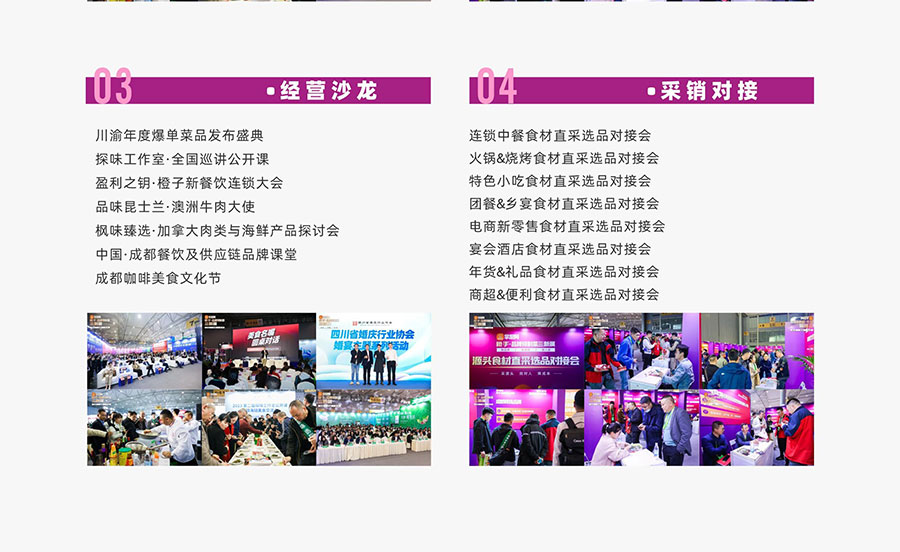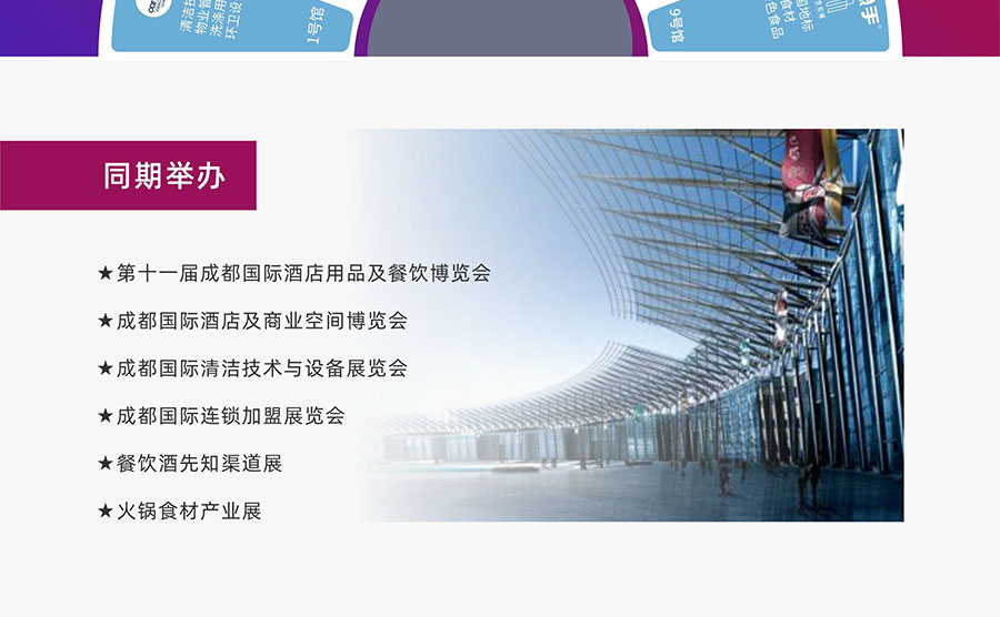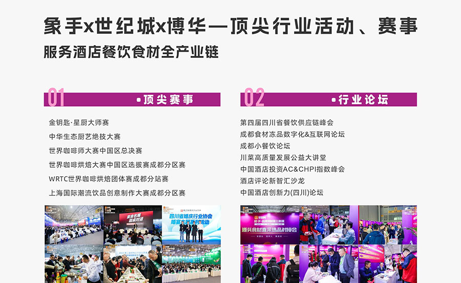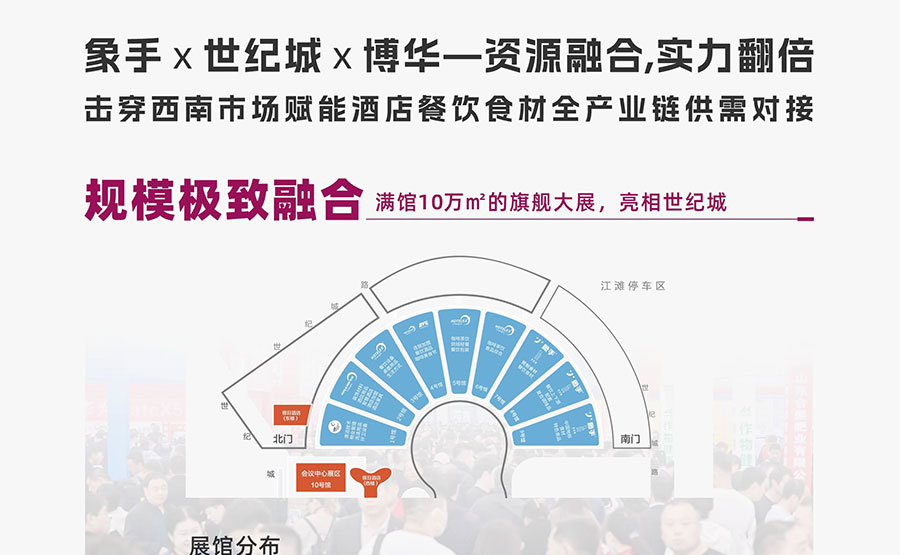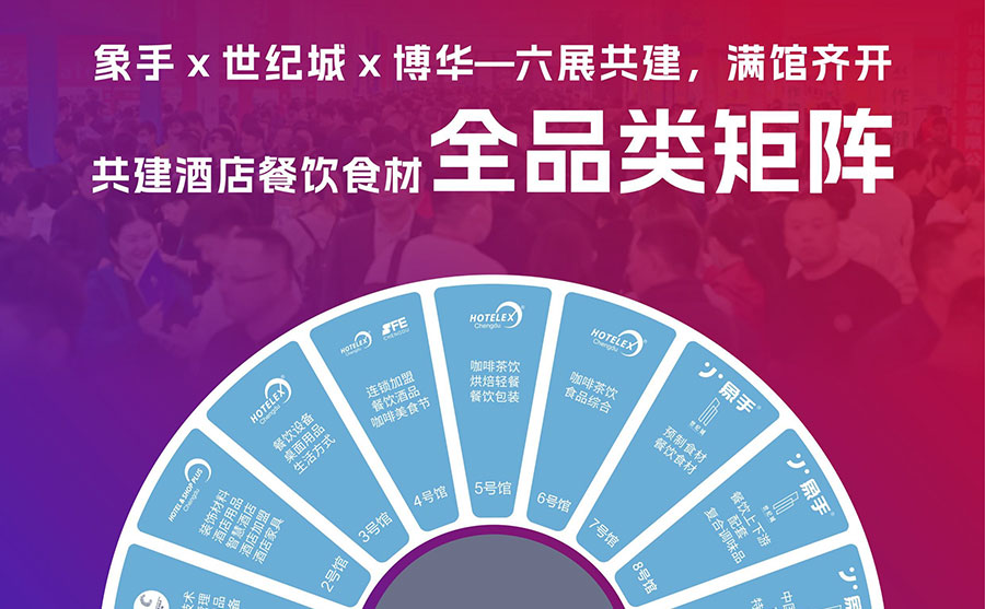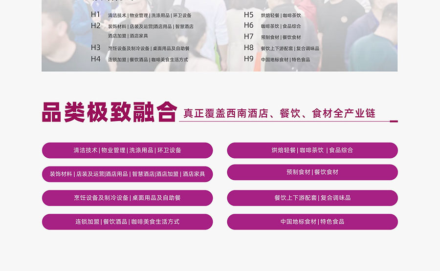 展出品类覆盖:肉禽预制食材、水产预制食材、面点预制食材、蔬果预制食材、餐饮品牌预制食材、火锅食材、复合调味品、咖啡茶饮、餐饮酒品、烘焙轻餐、食品综合、酒店加盟、餐饮加盟、冷链物流、餐饮设备、环卫设备、清洁技术、物业管理、洗涤用品、装饰材料、酒店用品、智慧酒店、桌面用品、生活方式等24大板块,是西南地区酒店餐饮食材全产业链的旗舰大展。