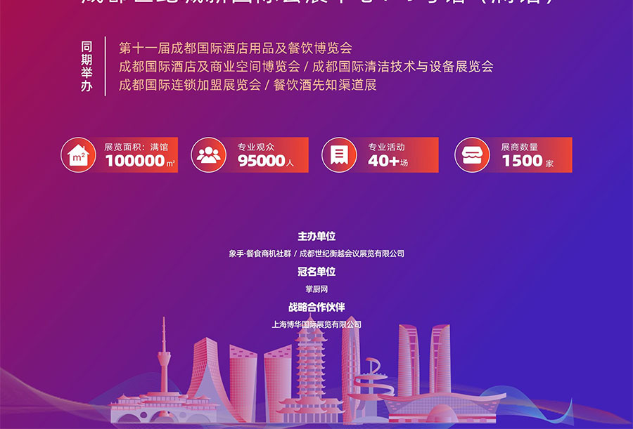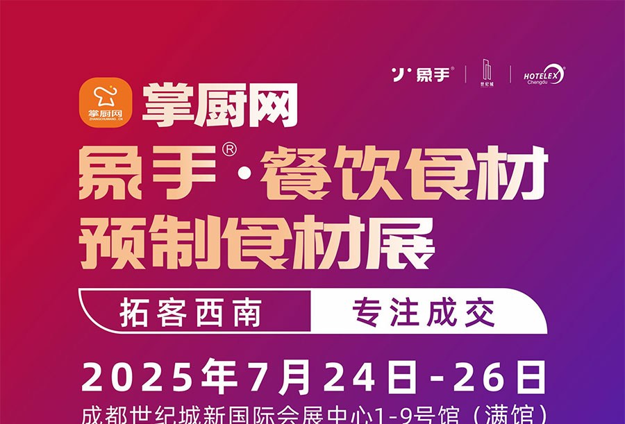 2025年7月24-26日,掌厨网-象手·餐饮食材&预制食材展,将在成都世纪城会展中心举行,同期举办:第十一届成都国际酒店用品及餐饮博览会、成都国际酒店及商业空间博览会、成都国际清洁技术与设备展览会、成都国际连锁加盟展览会、餐饮酒先知渠道展、火锅食材产业展。本届展会展览面积达100000㎡(满馆),汇聚1500家优质展商,邀请超95000名专业采购商,并举办40+场精彩活动。