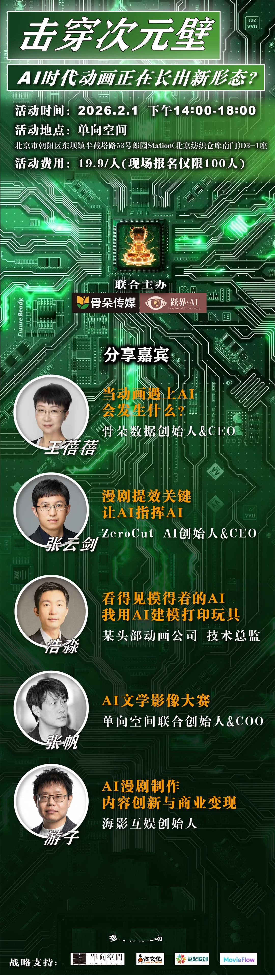 为此,我们特别发起这场名为“击穿次元壁”的主题沙龙。本场活动我们邀请了几位身处浪潮前沿的实践者,他们将围绕AI如何重塑创作、生产和商业生态展开真诚分享。话题将触及行业未来的方向、实战中的颠覆性工作流、从数字世界到实体消费的跨越,以及如何真正理解并连接新一代的观众。