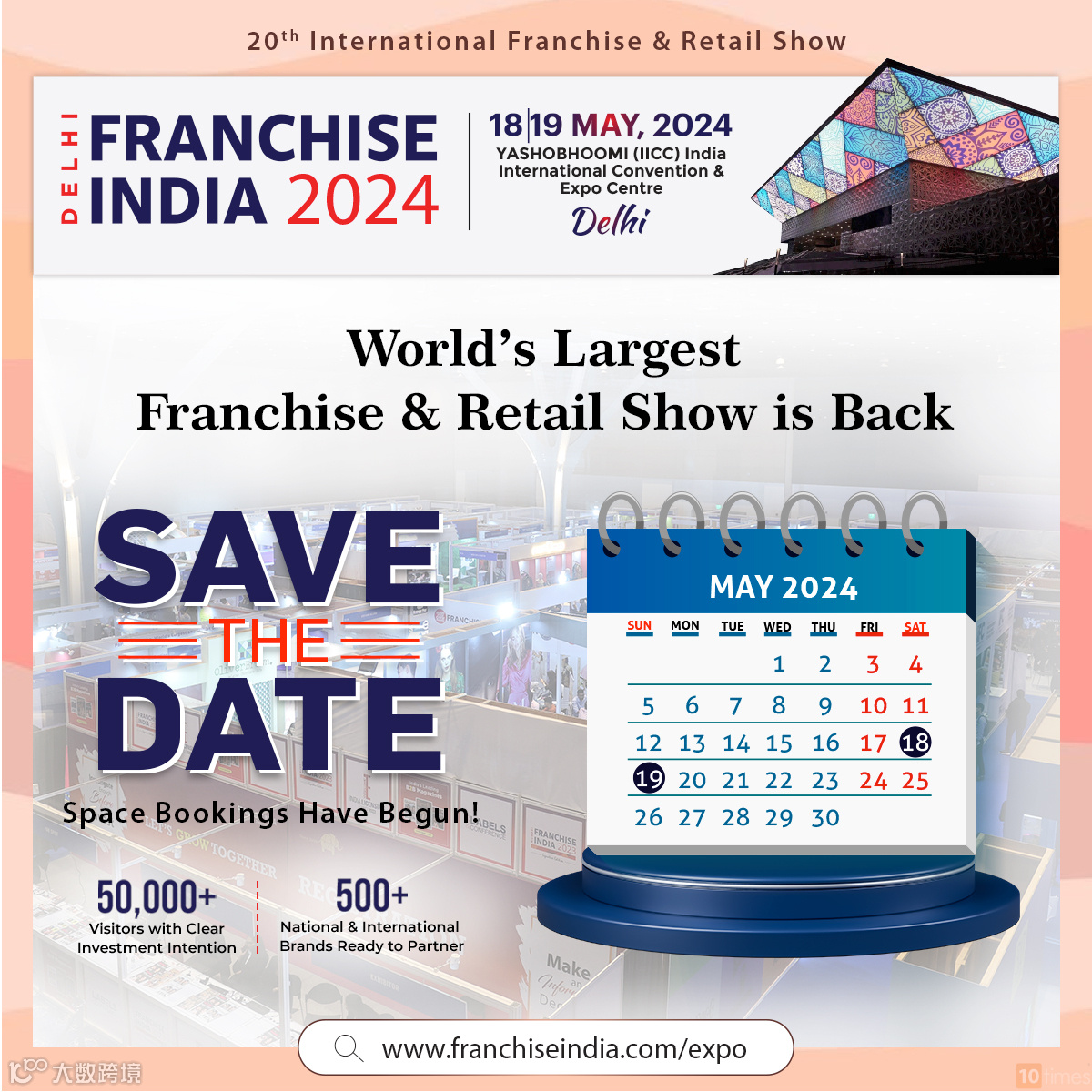 “全球最大的国际特许经营及零售展” 印度特许经营展——国际特许经营及零售展。这是印度唯一一个为国内外品牌提供特许经营业务买卖平台。各品牌将在不同的展馆设立展位,包括:特许经营展馆、小型企业展馆、品牌授权展馆、零售房地产展馆、印度企业家展馆、国际展馆和贷款中心。