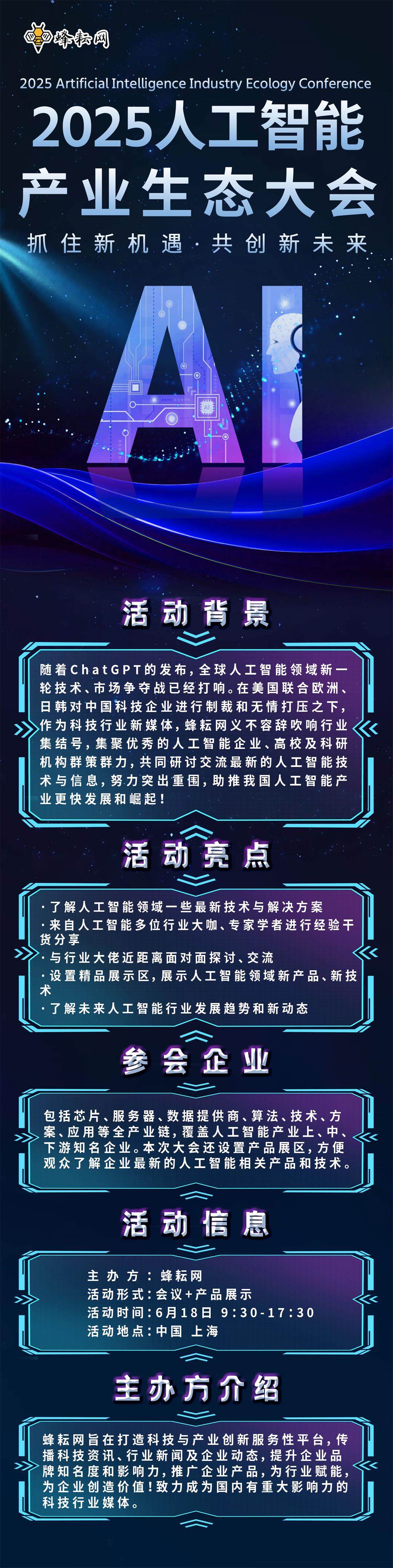 人工智能生态大会已连续举办二十多场!所到之处,引起观众强烈反响,好评如潮!已成为国内人工智能全国巡回活动的佼佼者!一路以来风雨兼程、砥砺前行、秉持初心、一往无前!2025人工智能产业生态大会上海站很快就要来了!