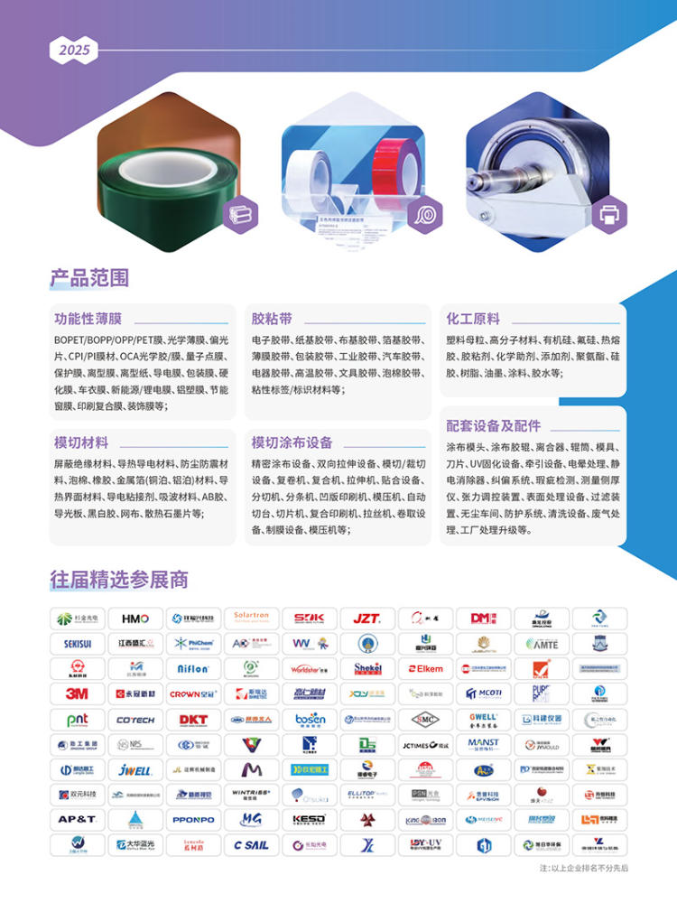 国际(上海)薄膜与胶带技术及应用创新展,致力于向高附加值应用行业展示薄膜与胶带及涂布模切领域的创新解决方案,并促进了上下游企业高效链接,挖掘潜在商机,推动产业可持续发展。为薄膜与胶带企业打造精准高效的供需对接与技术交流平台。本届展会将于2025年8月7-9日在上海新国际博览中心举办,同期举办DIC EXPO国际(上海)显示技术及应用创新展。展会预计将吸引300余家参展商及品牌集中展示前沿技术产品及应用解决方案,聚焦功能膜材、胶粘新材、模切涂布等领域。