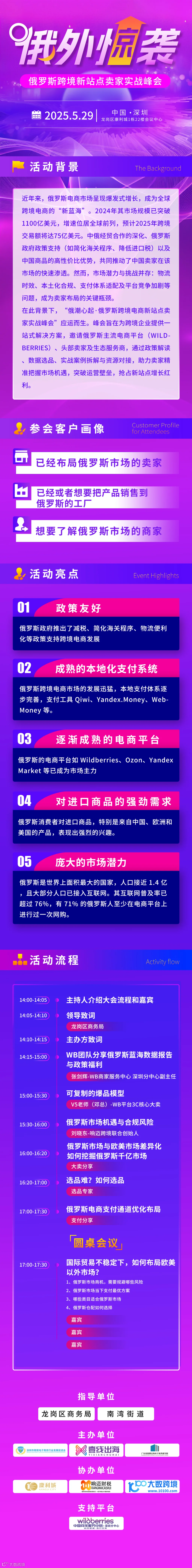 峰会旨在为跨境企业提供一站式解决方案,邀请俄罗斯主流电商平台(WILD.BERRIES)、头部卖家及生态服务商,通过政策解读,数据选品、实战案例拆解与资源对接。