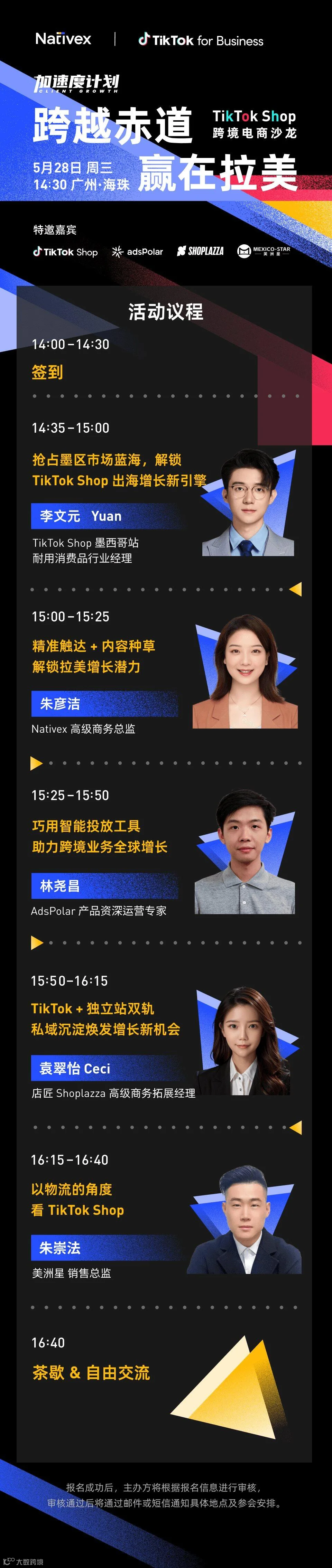针对以上问题,5月28日(周三)Nativex 联合 TikTok for Business,携手 AdsPolar、店匠 Shoplazza 与美洲星,将在广州海珠举办“跨越赤道·赢在拉美——TikTok Shop 跨境电商沙龙”。