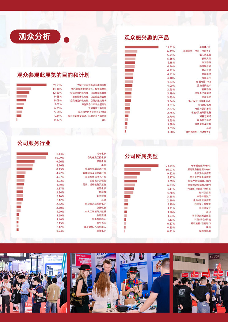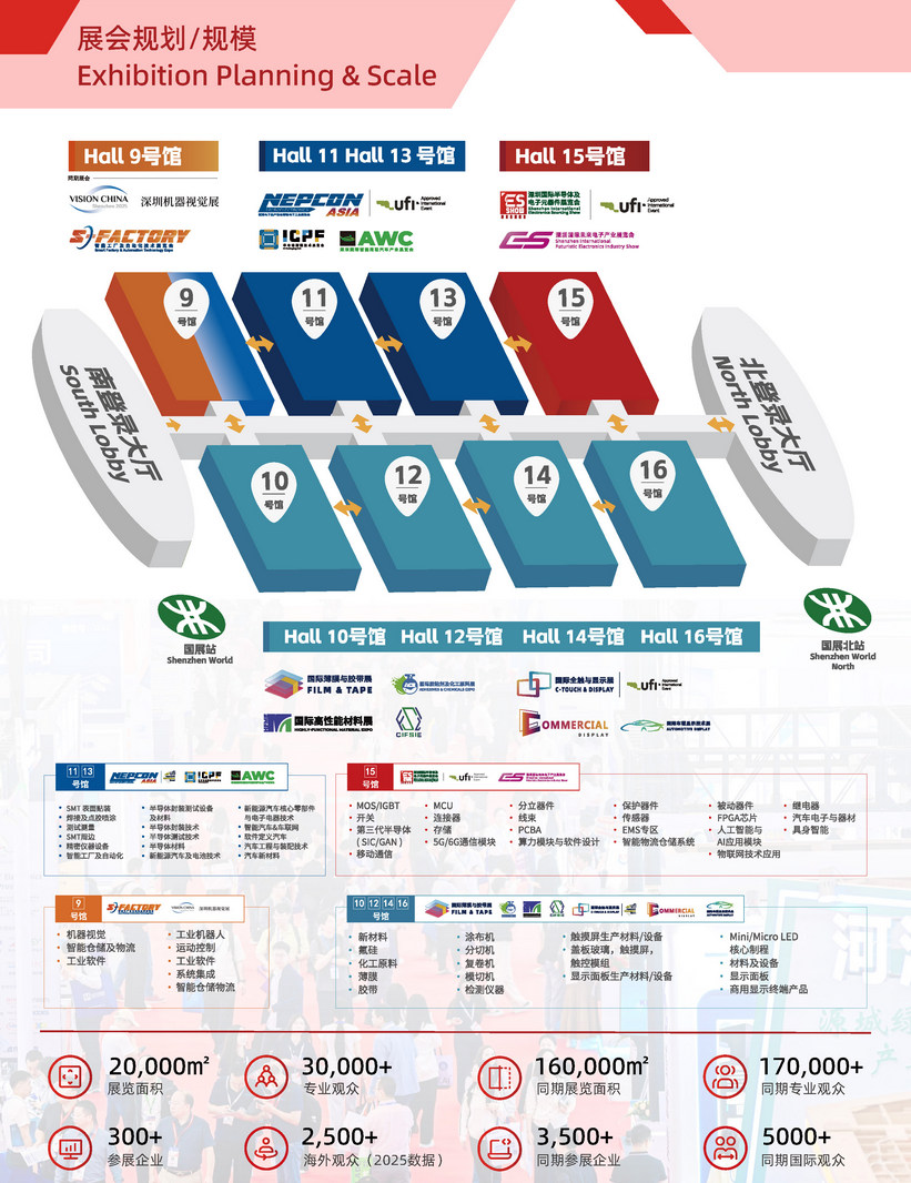 深圳国际半导体及电子元器件展览会(ES SHOW)与NEPCON亚洲电子生产设备及微电子工业展、S-FACTORY EXPO智能工厂及自动化技术展、汽车电子技术展同期举办。通过展示电子元器件及材料+电子制造设备+智能工厂及自动化设备+汽车电子技术等集成电子制造产业链产品及技术解决方案,服务所有“电子人”一站式采购平台。