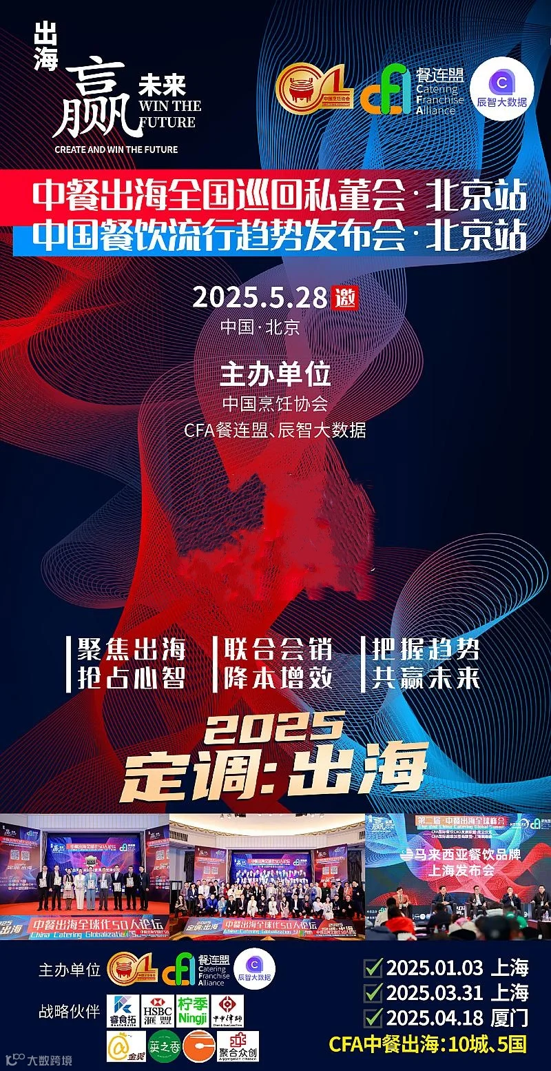 为助力中餐品牌开拓海外市场,【中餐出海全国巡回私董会暨中国餐饮流行趋势发布会】北京站将于2025年5月28日隆重举办。本次活动由中国烹饪协会、CFA餐连盟、辰智大数据联合主办,汇聚中餐出海领军者、海外市场专家及投资机构,聚焦中餐国际化战略、本土化运营、供应链优化等核心议题,通过主题分享、圆桌对话及资源对接,为餐饮企业提供实战经验与全球布局思路。