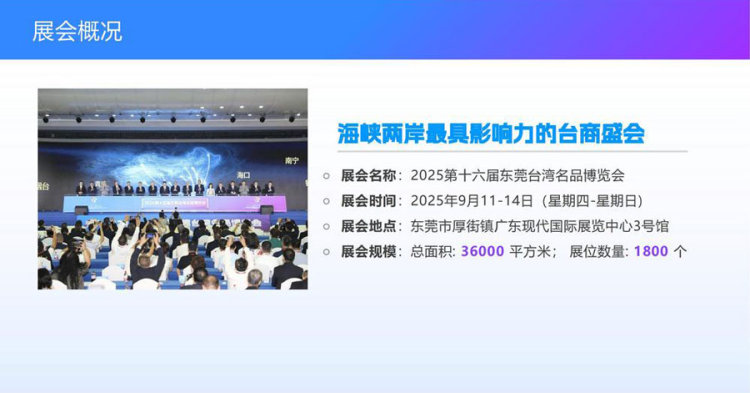 2025第十六届台博会将于9月11日至14日在广东现代国际展览中心举办,为期4天。规划展览面积扩大至3.6万平方米,预设展位2000个,计划邀约参展商500家。