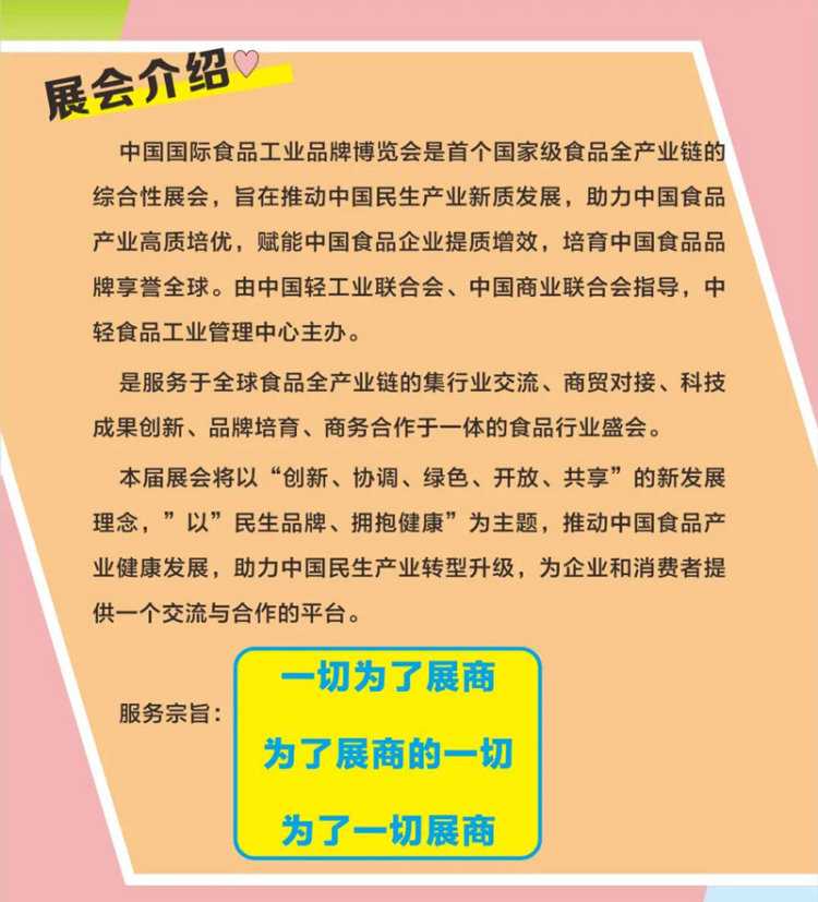 是服务于全球食品全产业链的集行业交流、商贸对接、科技成果创新、品牌培育、商务合作于一体的食品行业盛会。本届展会将以“创新、协调、绿色、开放、共享”的新发展理念,”以”民生品牌、拥抱健康”为主题,推动中国食品产业健康发展,助力中国民生产业转型升级,为企业和消费者提供一个交流与合作的平台。