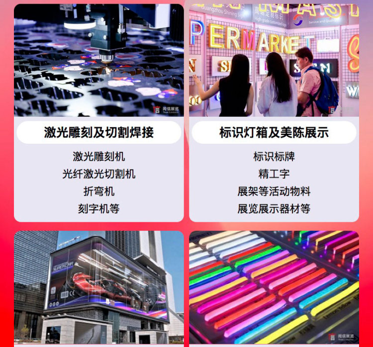 SIGN CHINA覆盖广告及数字标牌生态产业链,并于2005年成立LED CHINA,2016年将DS CHINA上海国际数字标牌展纳入其系列中,全面发展LED显示屏、LED照明、数字标牌等板块,与传统广告板块深度融合;三大展会同期举办,覆盖激光雕刻/切割/焊接/折弯设备、标识标牌、灯箱、广告板材、POP、户内外数码喷印设备及墨水、数码打印耗材、LED广告光源及照明、LED显示屏、数字标牌、广告机、LCD显示、触摸查询一体机、全息投影、多媒体信息发布系统等全产业链。
