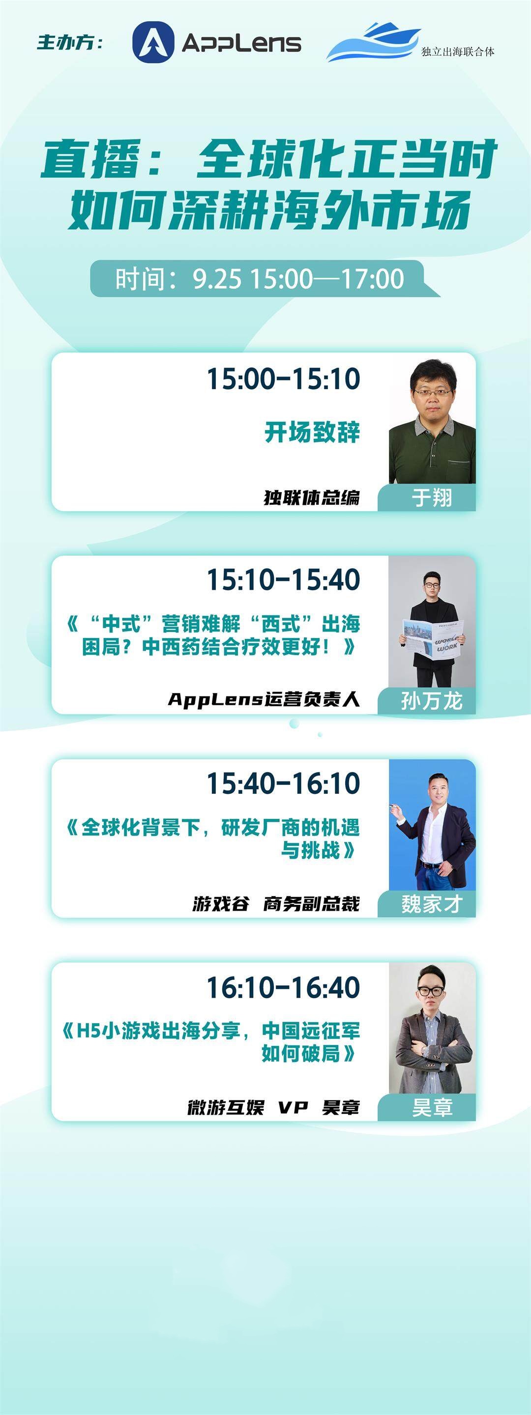 那么,在如此态势之下,移动游戏的优质流量获取应该向何处而求?中国游戏公司该如何协作共赢,竞逐海外市场?在全球范围内,又是否已经存在可以供H5小游戏生根发芽的全新土壤?带着这些问题,独立出海联合体携手AppLens举办了这场“全球化正当时,如何深耕海外市场”线上主题沙龙,并邀请AppLens运营负责人孙万龙、游戏谷商务副总裁魏家才、微游互娱VP昊章等嘉宾共聚一堂,以不同视角再议中国游戏全球化之征程。
