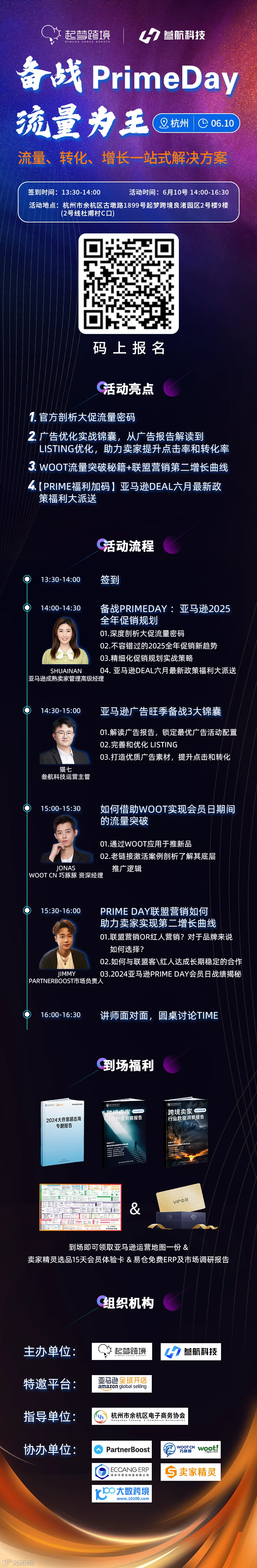 活动亮点:1.官方剖析大促流量密码2.广告优化实战锦囊,从广告报告解读到Listing优化,助力卖家提升点击率和转化率3.Woot流量突破秘籍+联盟营销第二增长曲线