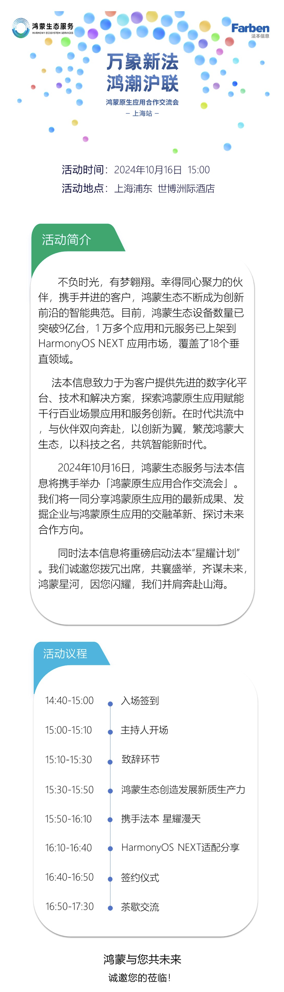 鸿蒙原生应用合作交流会-上海站 -活动时间:2024年10月16日 15:00活动地点:上海浦东 世博洲际酒店