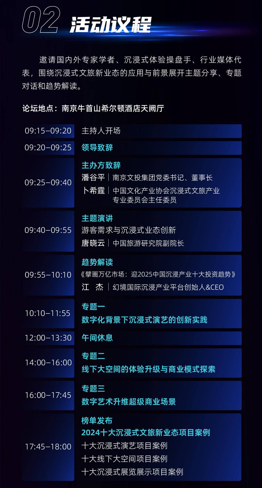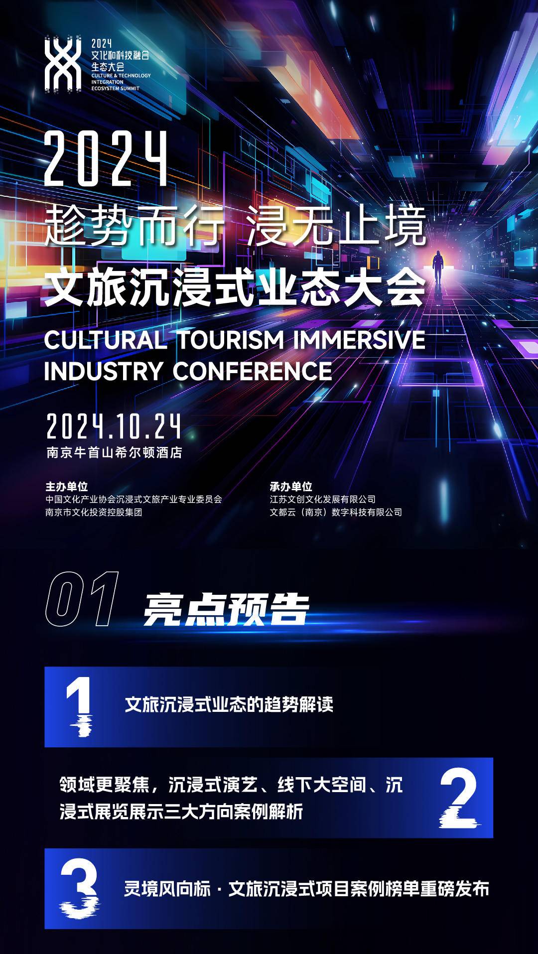 作为文化和科技融合生态大会的核心单元,文旅沉浸式业态大会由中国文化产业协会沉浸式文旅产业专业委员会与南京文投集团共同主办,江苏文创文化发展有限公司、文都云(数字)科技有限公司承办,将聚焦沉浸式演艺、线下大空间、沉浸式展览展示等前沿领域,探讨技术革新、文化传播、体验升级及业态创新的实践与应用。