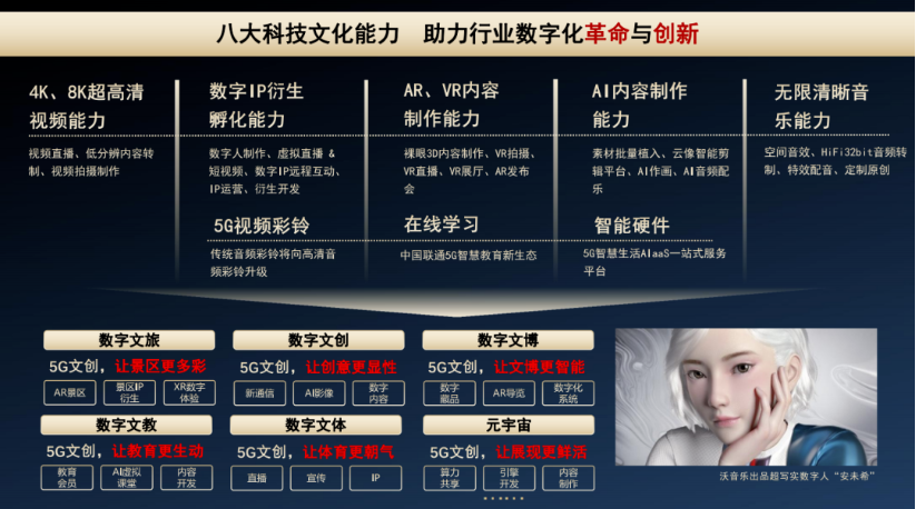 联通在线广州公司(简称“沃音乐”),是联通在线旗下子公司,负责中国联通数字文化领域专精特新技术、产品研发创新,是国内最早布局5G新文创产业的运营商企业。立足新征程,沃音乐落实集团公司战略及联通在线“1+2+9”工作总体纲领,全面深耕数字文化产业,以文化为内核、以AI为驱动,打造了“AI+人货场”的数字文化消费新场景和“AI+云网端”的文化数字化新产业。沃音乐夯实“1234”数字文化平台架构,构建2B2C2I协调发展体系,奋力打造科技型数字文化公司。