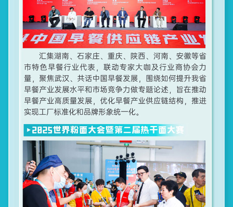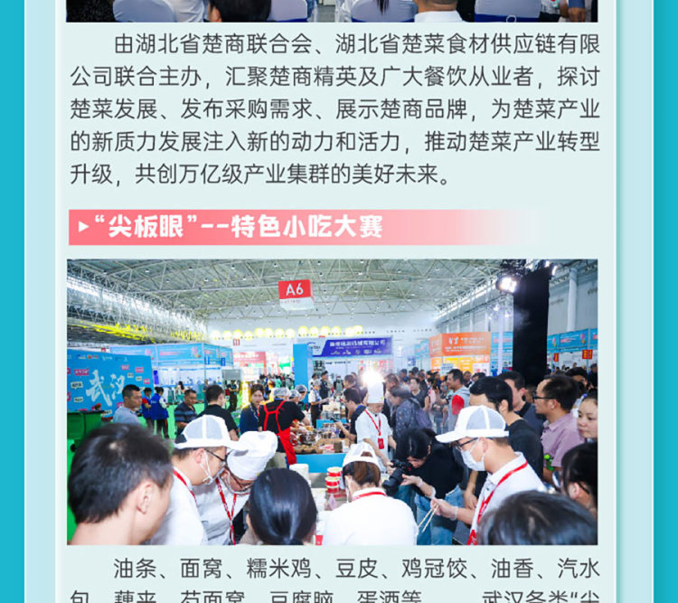 以“早餐文化"成为武汉的宣传标签,让“楚菜优品”成为湖北餐饮文化的靓丽名片,全力打造楚菜全产业链展示与交流的平台,推动楚菜标准化、品牌化发展,助力早餐食材企业深度开拓华中早餐万亿市场。