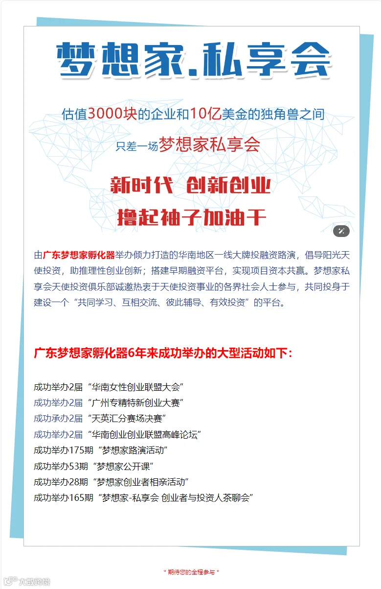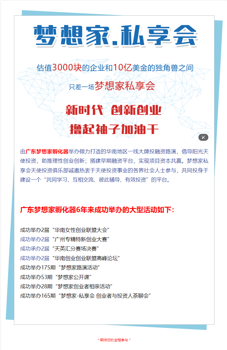 亮点3:了解行业境况,用一场活动拓宽人脉这里有一线自媒体天使投资人、十余年地图的资深天使投资人、30多家基金的投资方决策层、多行业创业成功转型的天使投资人等。私享会用一场活动拓宽人脉。