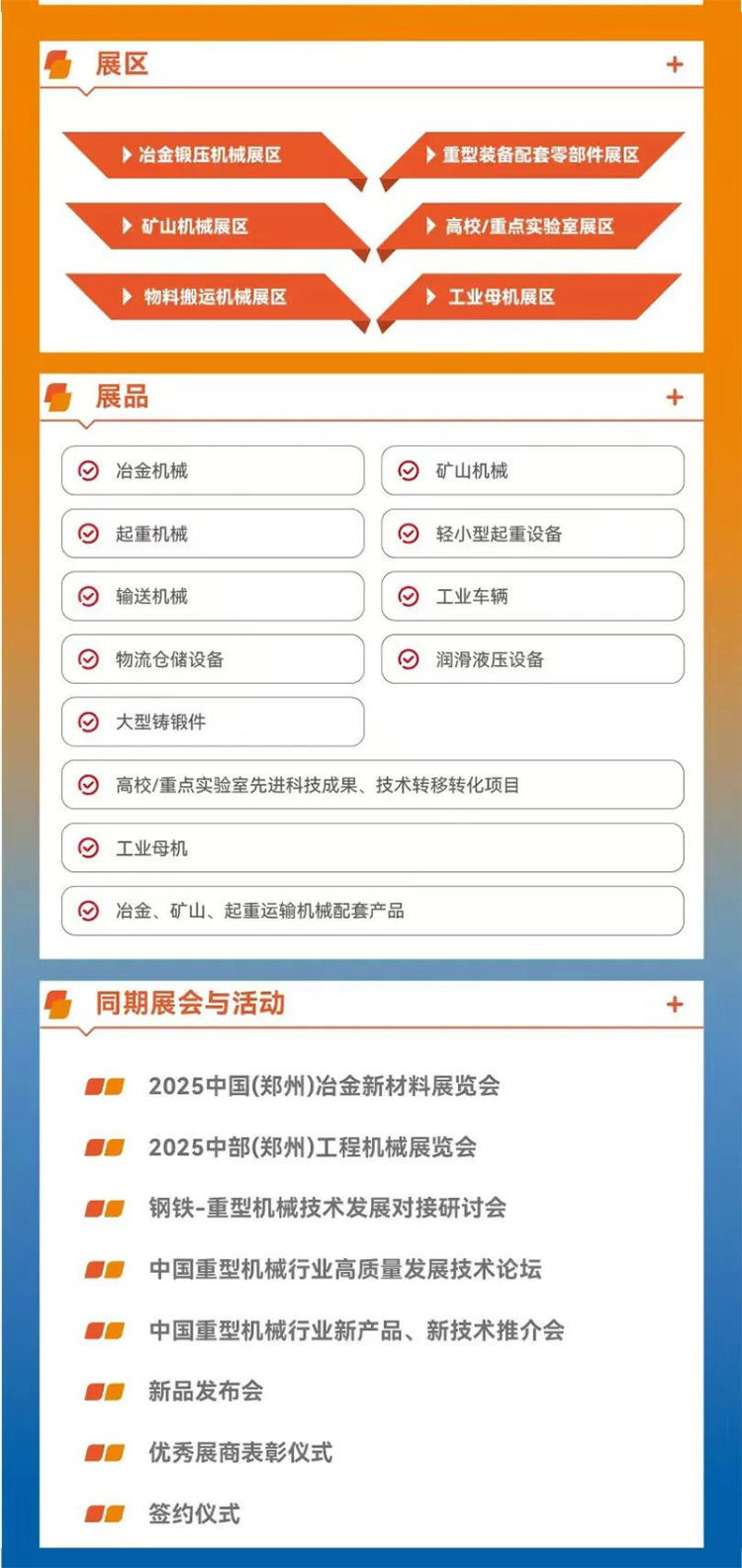2025中国(郑州)重型机械装备展览会定于2025年10月15日-17日在河南省郑州市中原国际会展中心举办。作为中国重型机械行业领域中唯一的专业性展会,多年来得到国内外重型机械行业链主企业、头部企业及用户单位和供应商的大力支持,特别是近两年统筹上下游产业链供应链协同发展理念,品牌建设、品牌核心价值观进一步显现,展示展览效果不断提升,展会规模需求快速增长。在高端、绿色、智能发展背景下,展会专注创新链全产业链深度融合发展,打通装备制造业和用户行业交流通道紧扣行业热点,集中展示重型机械行业科技成果转化实效。