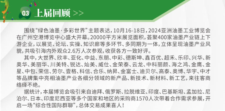 届时,力邀海内外众多油墨应用、生产企业、经销商、代理商、行业协会、科研院校等业界精英共同参与,一展立体、向荣的油墨产业面貌。