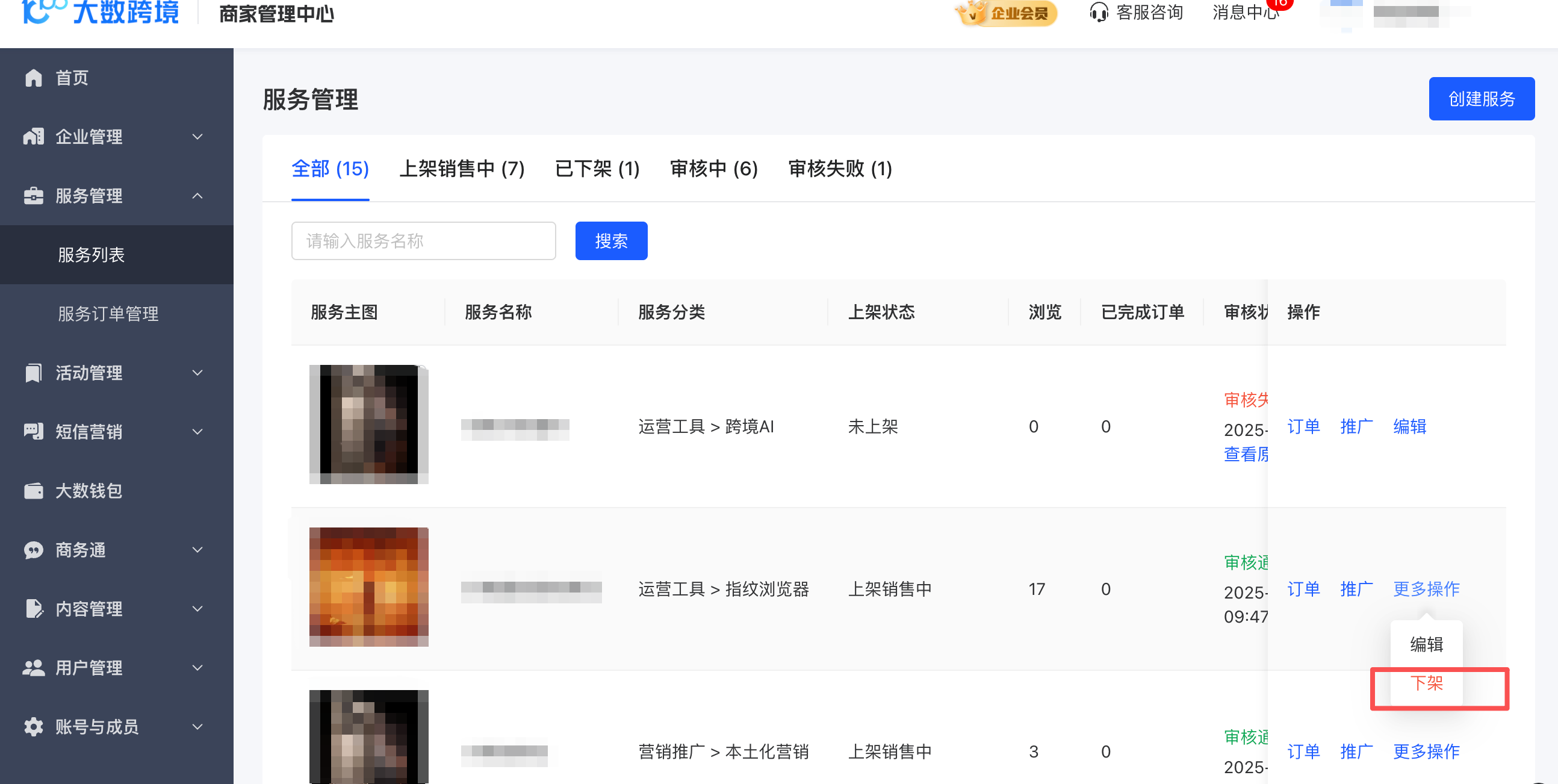2、可对已上架服务进行下架操作,如果后续想要重新上架,仍需重新审核通过后才能上架
